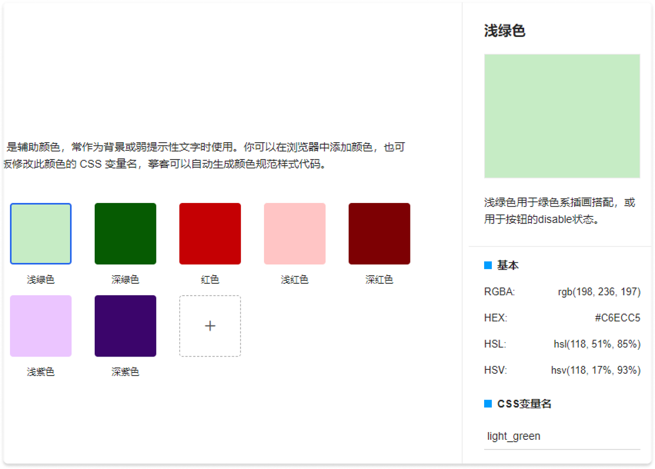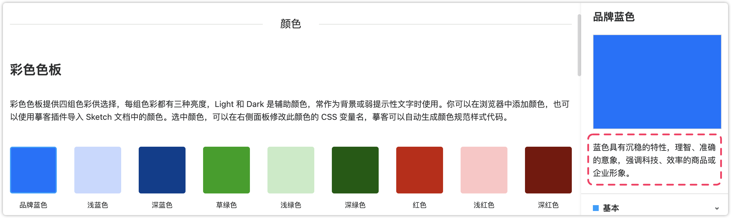 描述信息:颜色分类下,摹客默认提供了该颜色的使用场景,方便参考。
