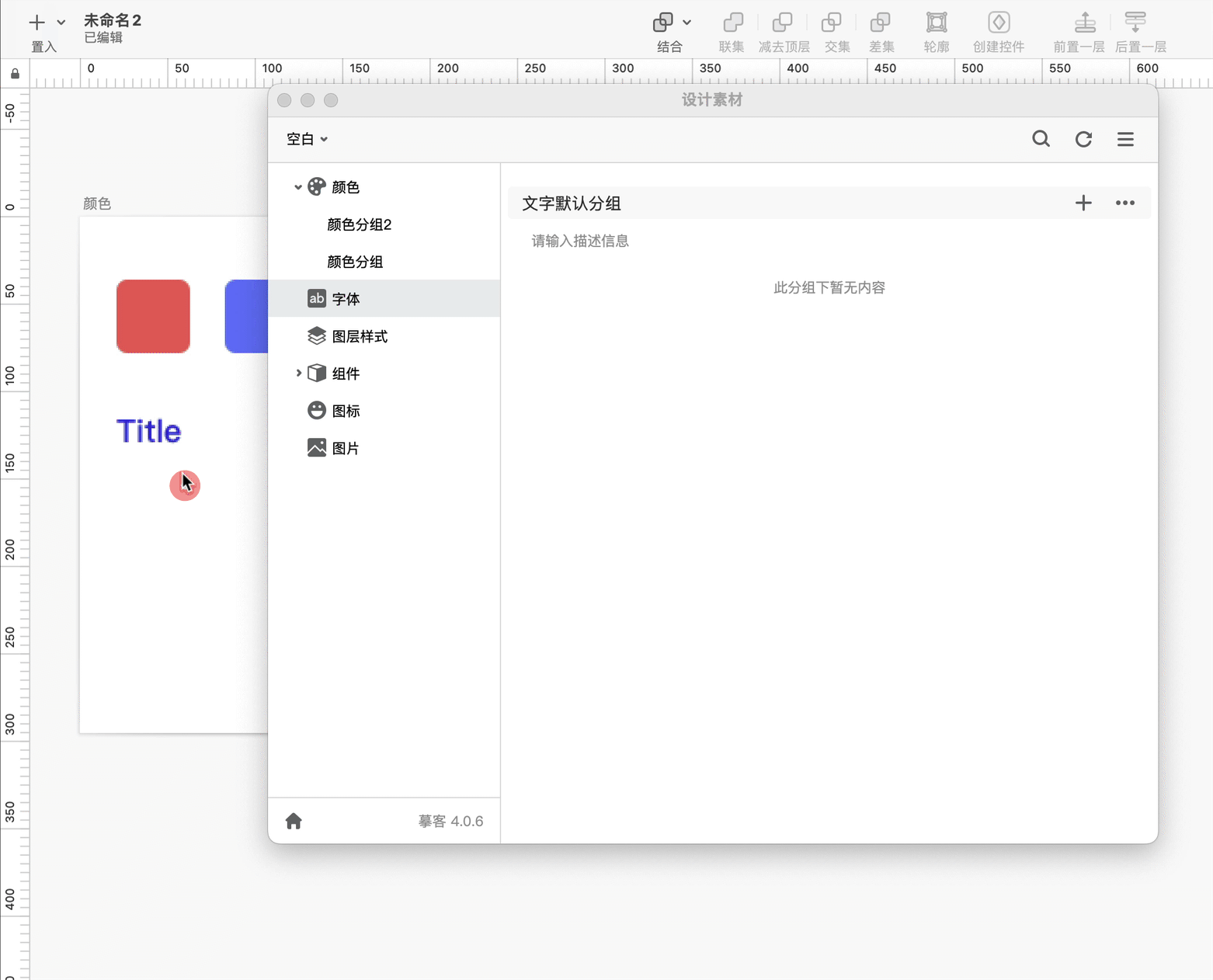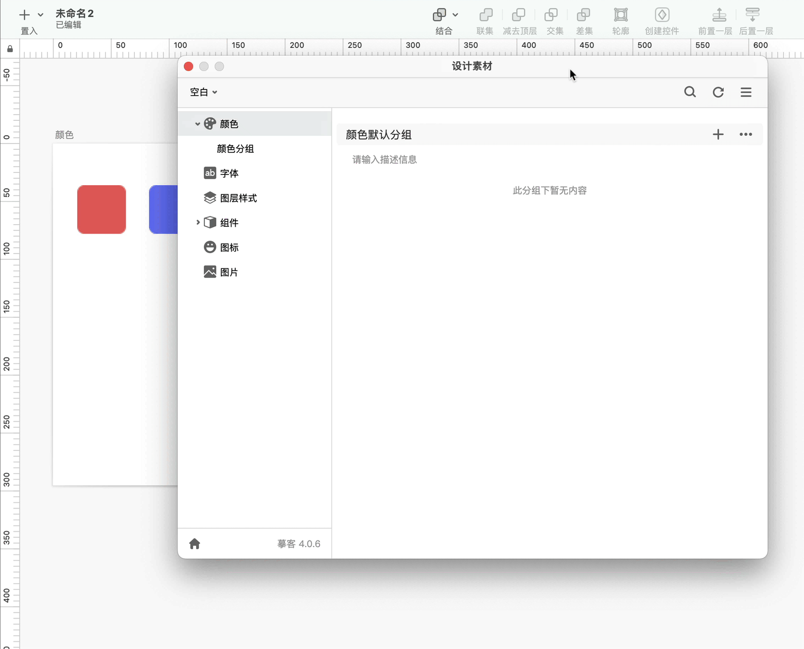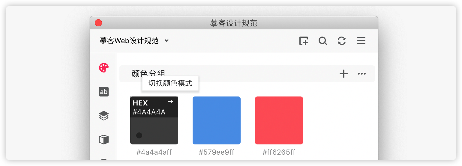 在颜色分类下新建一个分组。在设计稿上选中一个颜色图层,点击分组名称右侧的”+“,即可添加颜色资源到摹客设计系统。