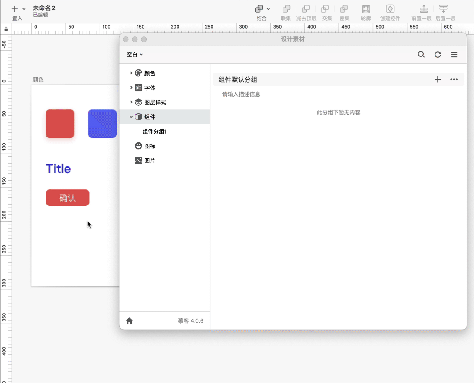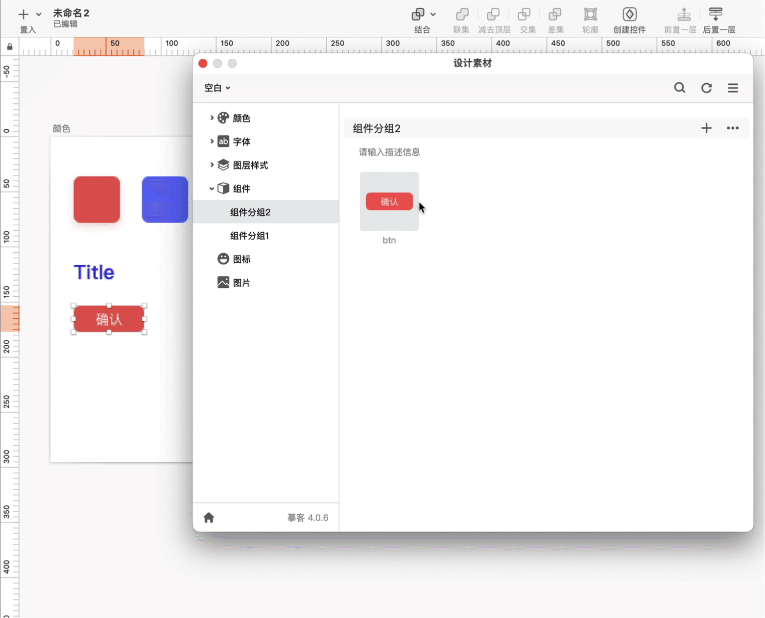 在组件分类下新建一个分组。在设计稿上选中一个组件(如按钮),点击分组名称右侧的”+“,即可添加组件到摹客设计系统。