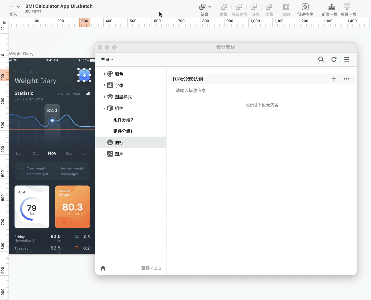 直接将Sketch插件“图标”分类中的组件拖拽,即可将该组件快速应用到图层上。