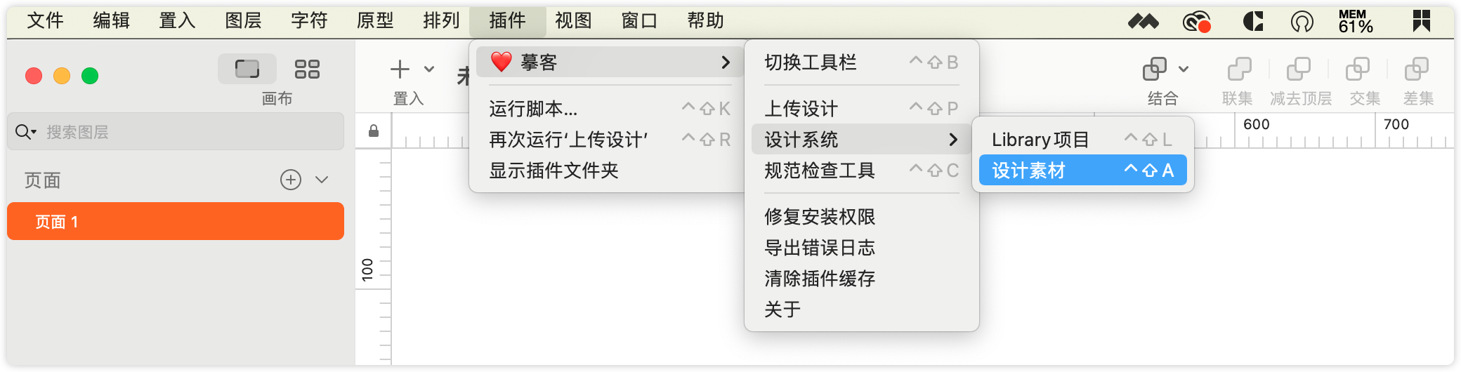 在Sketch上方菜单栏找到「插件」→「摹客」→「设计系统」→「设计素材」,点击即可使用。