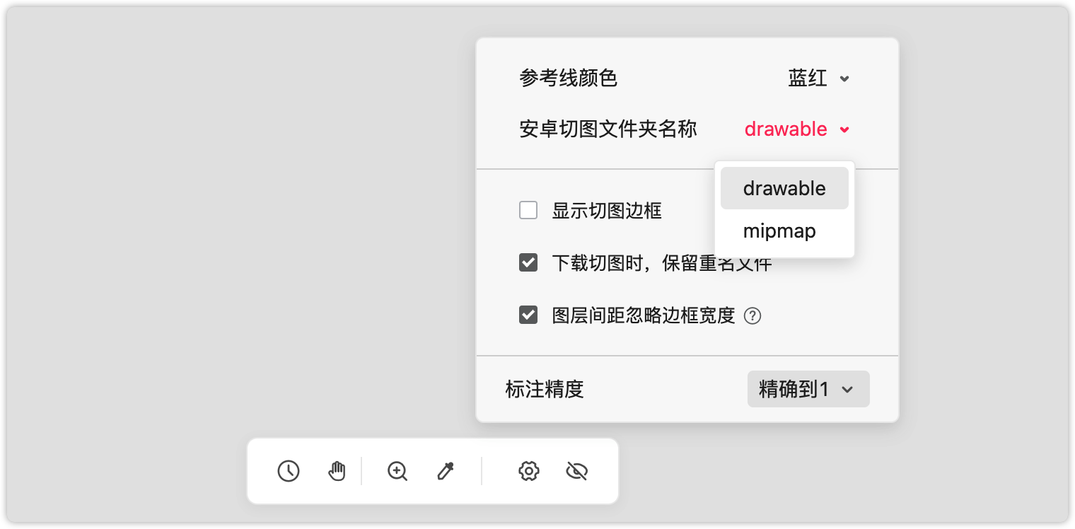 在开发模式中,如果选择了 Android 开发平台,点开左下角的设置按钮,可以设置安卓切图文件夹名称为 drawable 或 mipmap 。