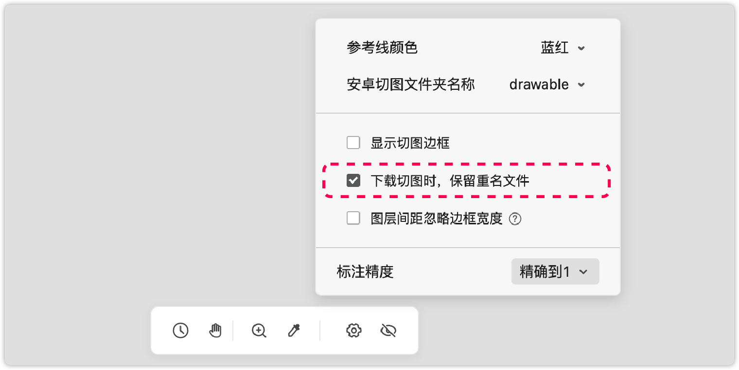 如果有多个重名切图,且下载时需要将重名文件去除。在开发模式中,点击设置按钮,取消勾选“下载切图时,保留重名文件”即可。