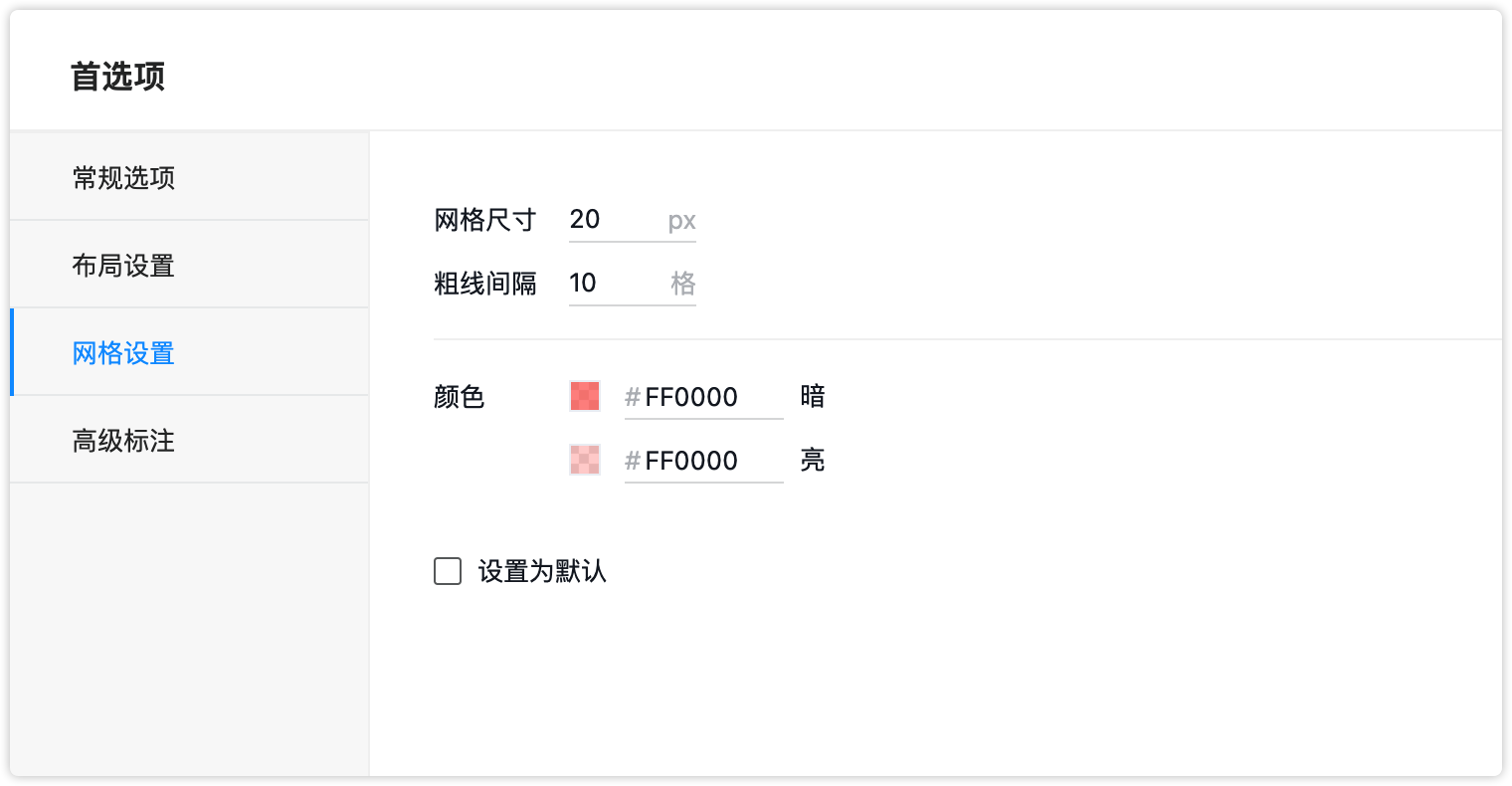 - 勾选“设置为默认”后,当前参数会作为后续新开启的网格的默认设置。