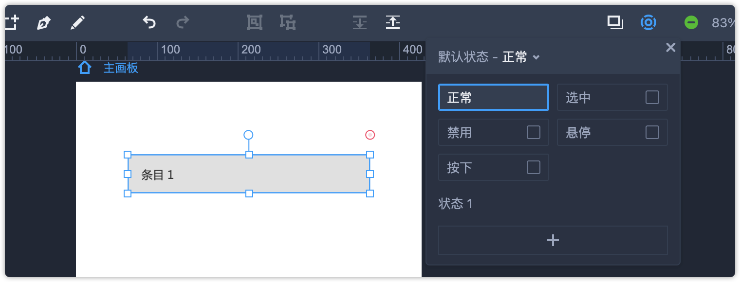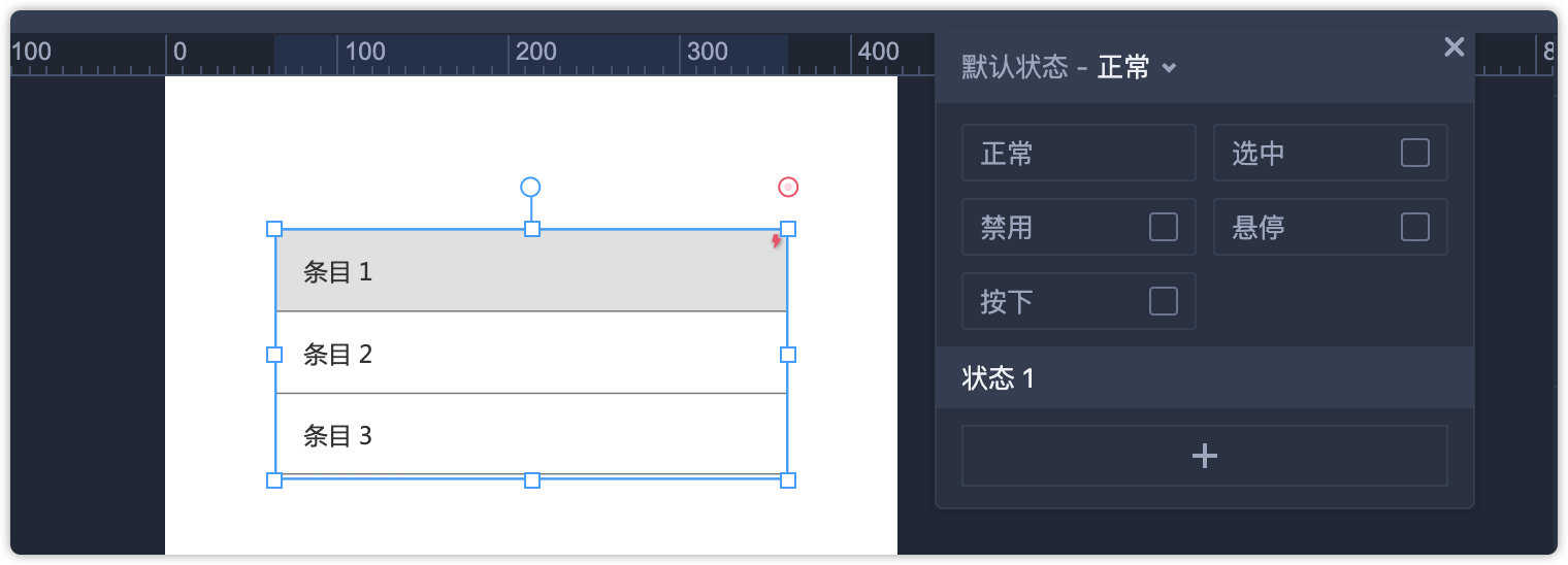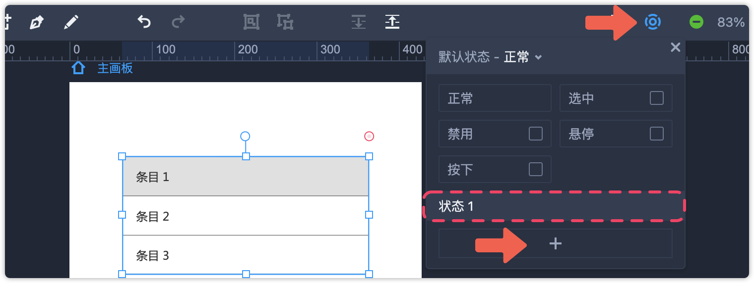 第3步:上一步中我们已经将每个列表转为了面板,接下来选中面板,打开箭头所示的状态弹窗,为面板添加一个状态1,如下图所示。再分别将另外两个面板做同样的操作。