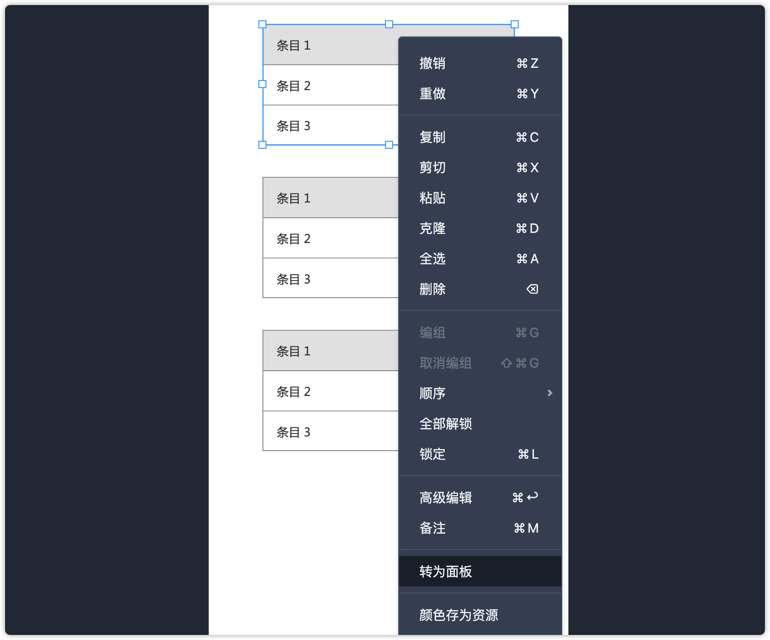 第2步:分别选中每个列表,右键将->转为面板。