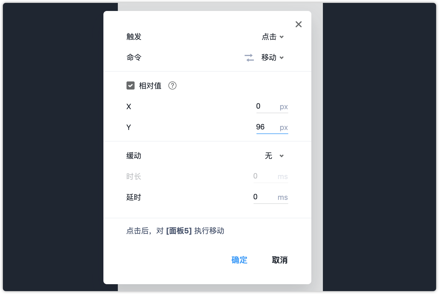 第6步:选中第一个面板,点击右上角圆点连向下一个面板,命令为“移动”,Y值为96px。(注:列表组件单项的高度是48px)这个交互是实现点击第一层列表后,第二层列表下移的效果。