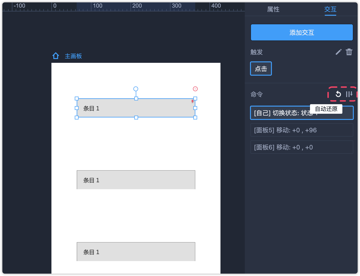 第10步:分别选中每个面板,给右侧的交互中勾上“自动还原”和“同时进行”的设置。