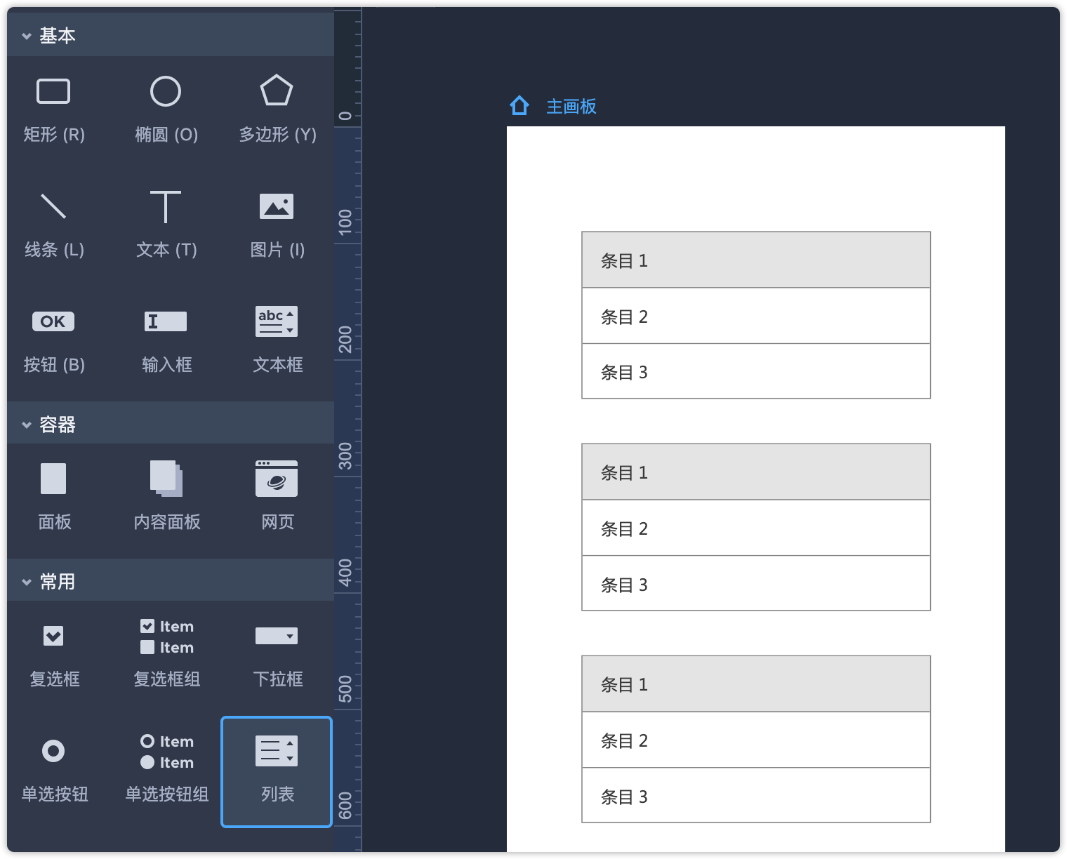 第1步:从组件库中拖出3个列表组件。