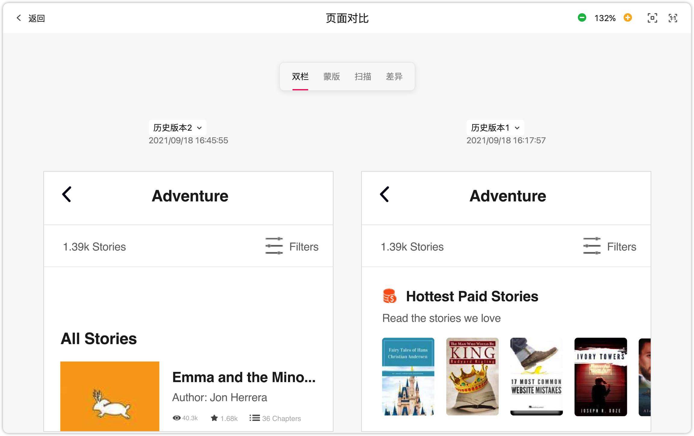 对设计稿进行修改、覆盖上传,或者对页面进行替换后,摹客自动会产生历史版本。在摹客的版本对比功能中,可以对历史版本进行蒙版、扫描和差异对比查看,方便设计师更清楚地了解设计稿不同版本的差异。不同设计稿之间也可以轻松对比。