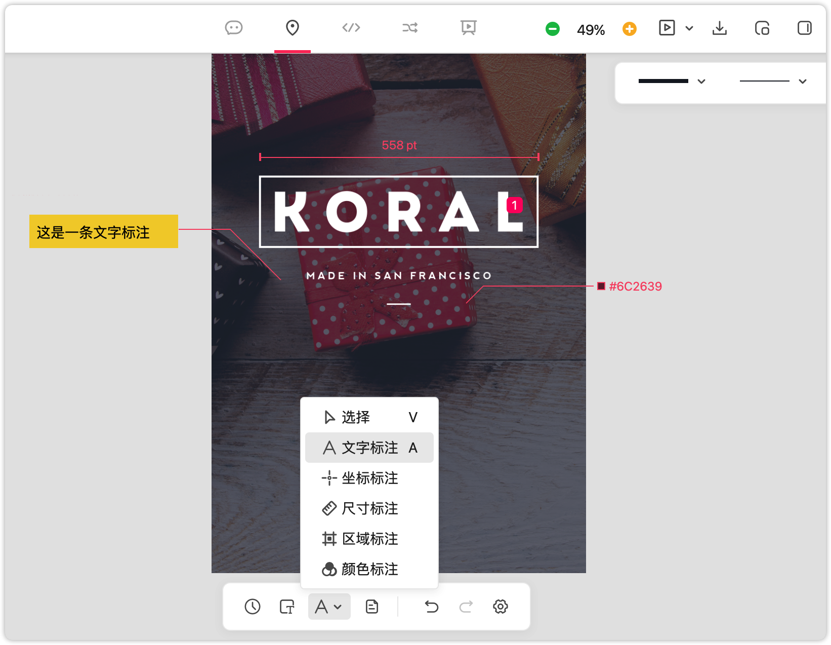摹客是唯一同时支持手动 + 自动标注方式的产品。除了自动标注外,摹客还支持多种手动标注:文本标注、坐标标注、区域标注、尺寸标注、颜色标注。