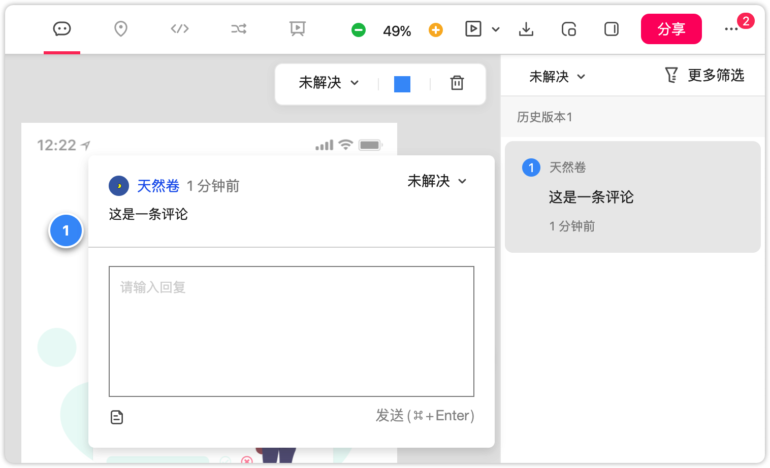 在评论模式中,成员可以使用图钉工具给设计稿添加评审意见。选择图钉工具,在设计稿任意位置都可添加评论。还可以修改评论的解决状态为:“已解决”、“未解决”或“关闭”。当设计稿有修改,重新上传后,图钉会跟随历史版本显示。