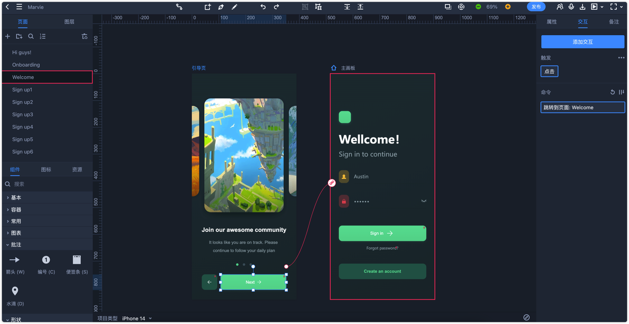 摹客原型提供了流程图绘制功能。原型结合流程图,帮助产品经理更好地表达与沟通。流程线的样式也可以自由调整哦。