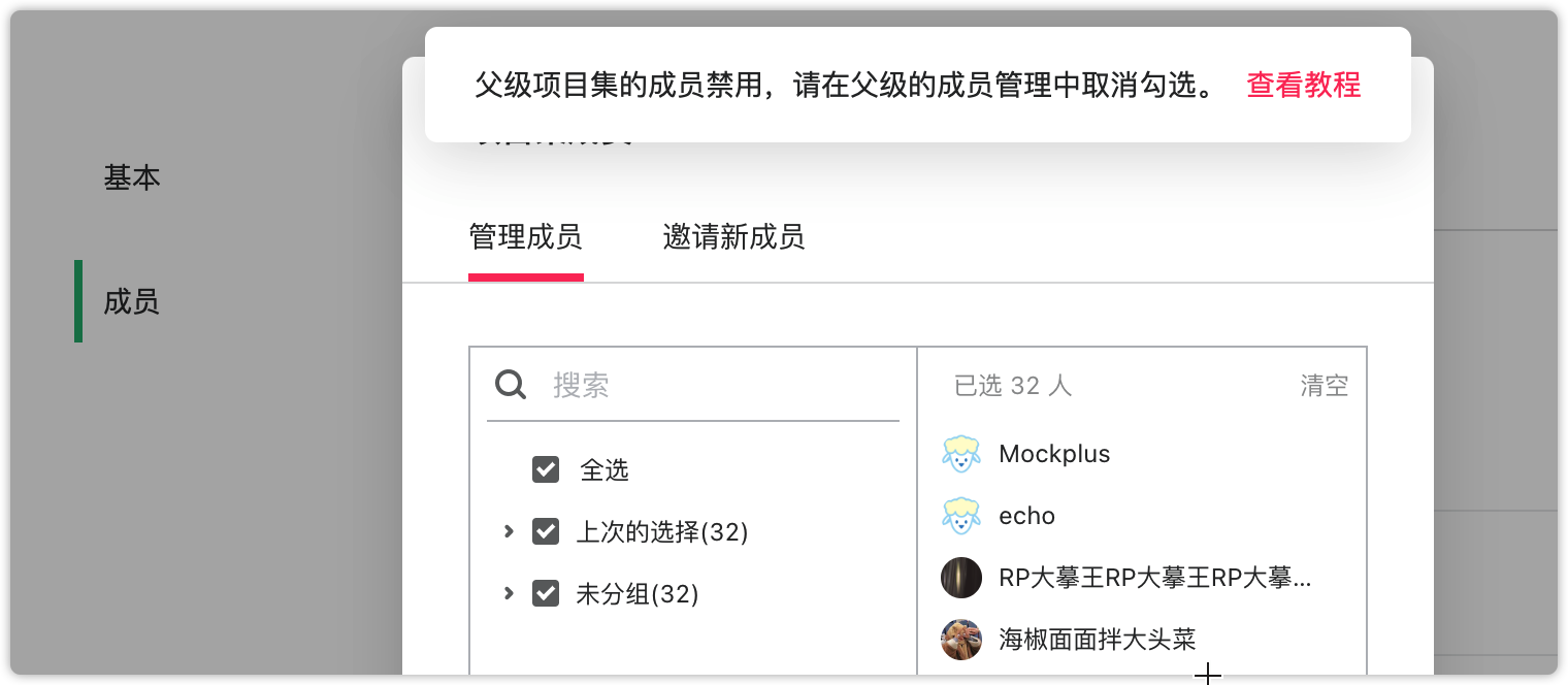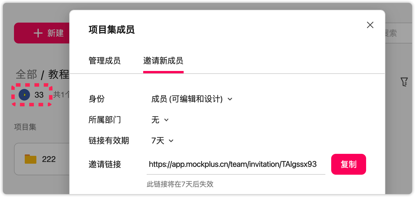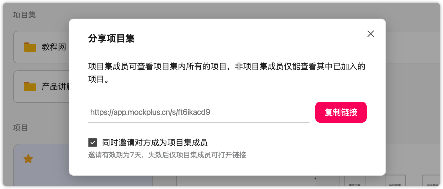 分享项目集时,摹客提供了一个选项:“同时邀请对方成为项目集成员”。勾选后,可以同时邀请对方成为此项目集的成员(此选项的权限仅管理员、超级管理员和项目所有者拥有)。