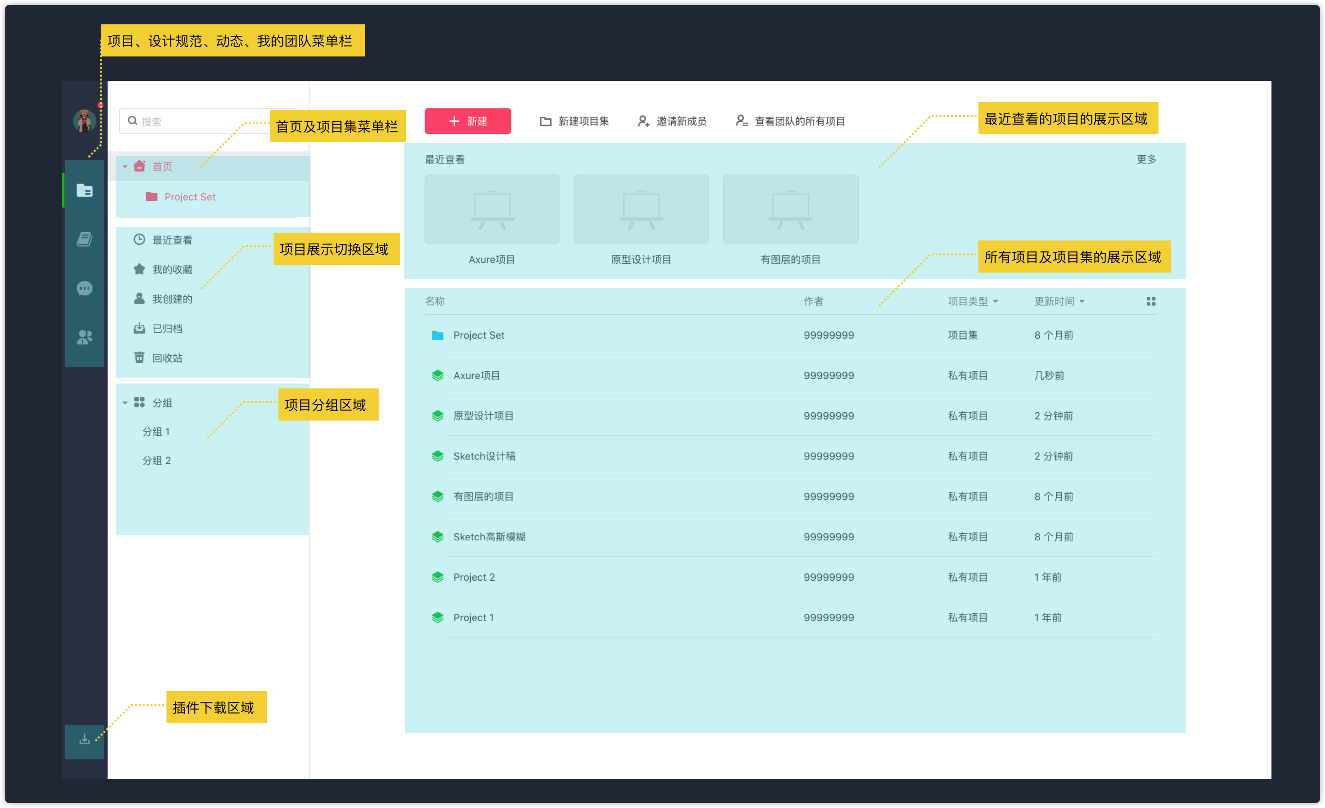 首先我们对首页的布局进行了全新的设计:最左侧的功能分区涵盖了项目、设计规范、动态和团队管理四个模块。左侧列表栏则将项目集、项目的分类、项目分组进行了归纳整理,切换分类的操作尽量集中在左部。右侧则留出足够的空间来对项目进行排布。