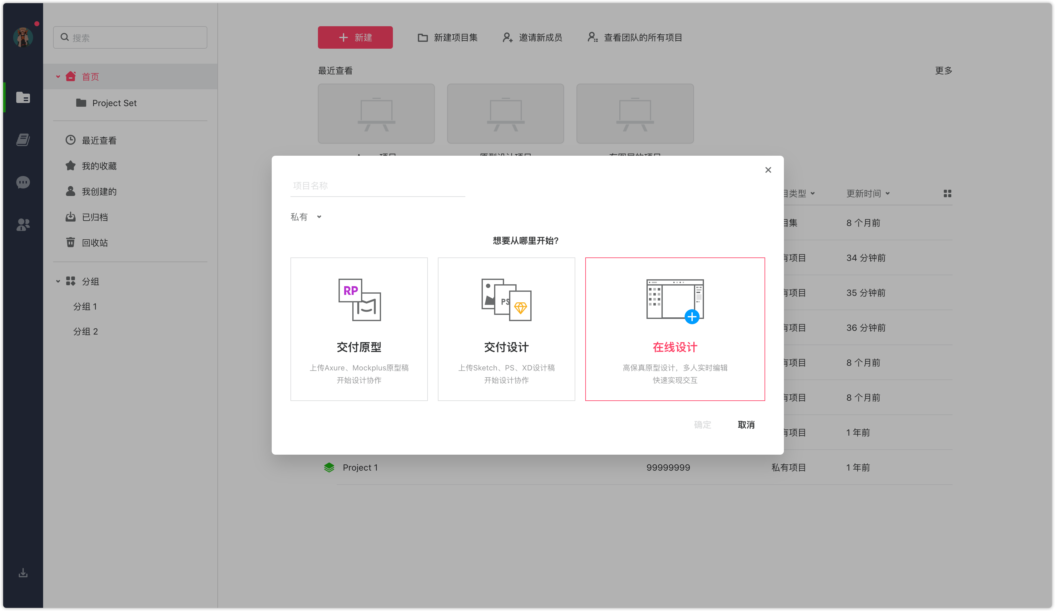 在这个版本之前的“协作项目”、“原型设计项目”、“Axure项目”、“Mockplus项目”,都已经不再是独立的个体。我们将不同类的项目都整合在了一个项目中,从现在开始就抛开项目类型吧!设计师可以把Axure、Sketch等等的设计稿都可以传到一个项目中来。新建时,只要选择从哪里开始就好。