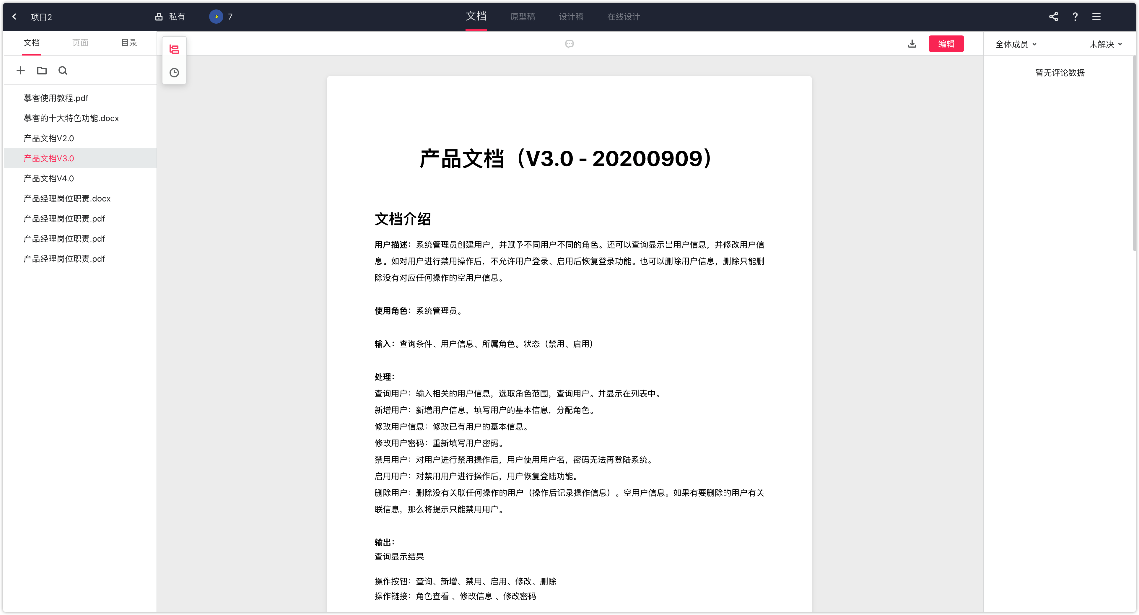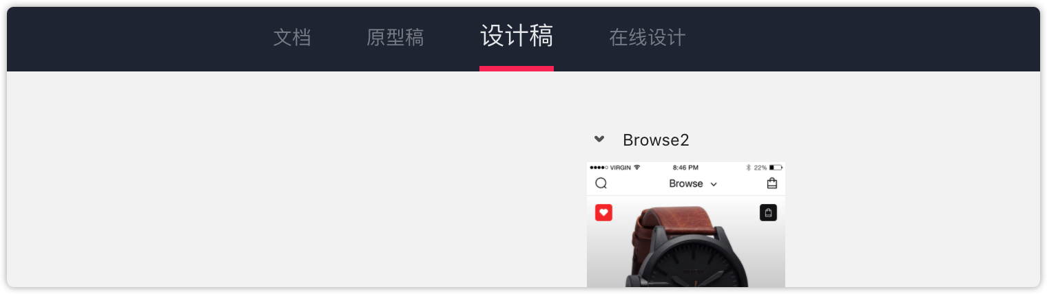 进入项目,可以看到四个不同的标签,分别对应着需求文档、第三方原型稿、第三方设计稿、在线原型设计。这个改动,对团队的效率有质的提升。
