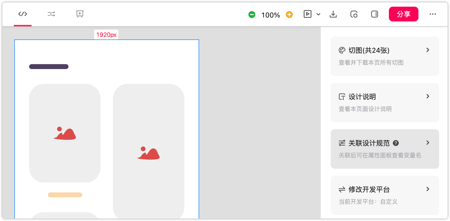 开发模式中,可以将项目与设计规范关联。关联后,在查看设计稿的属性面板上,会展示颜色的变量名。方便开发工程师快速获取变量名。