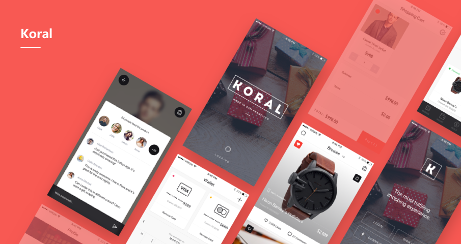 Koral是一款设计简洁交互新颖的电商类App,该款App运用大量滑动手势,使购物的流程变得更加顺滑流畅。例子中将展示使用Koral查看商品的用户留言并添加购物车购买的操作流程。我们可以使用摹客中最常用的8种交互方式以及15种交互动画,展示基本的页面跳转,以及模拟文字输入的效果。演示如下: