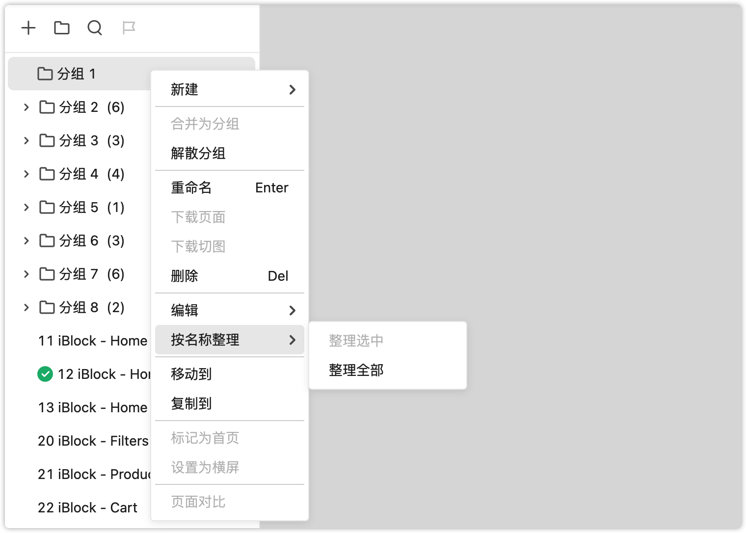 在项目树的右键菜单中,新增了一个“按名称整理”的选项。选择按名称整理后,页面列表会按照数字或首字母顺序来排列,方便快速整理。