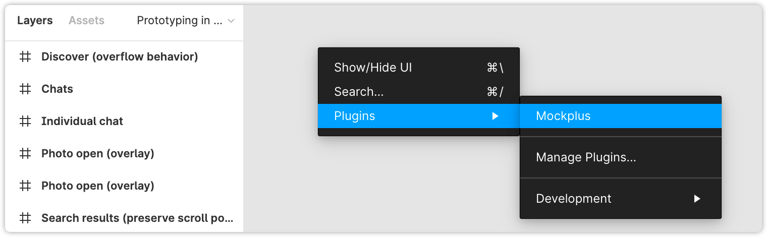 插件安装好后打开Figma,任意打开一个项目后,在画布空白处右键 -> Plugins -> Mockplus。