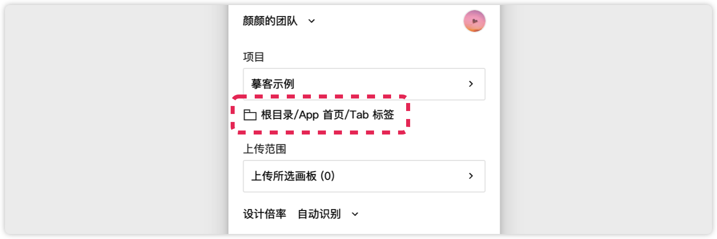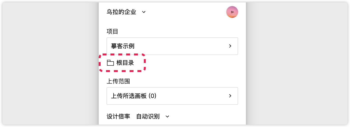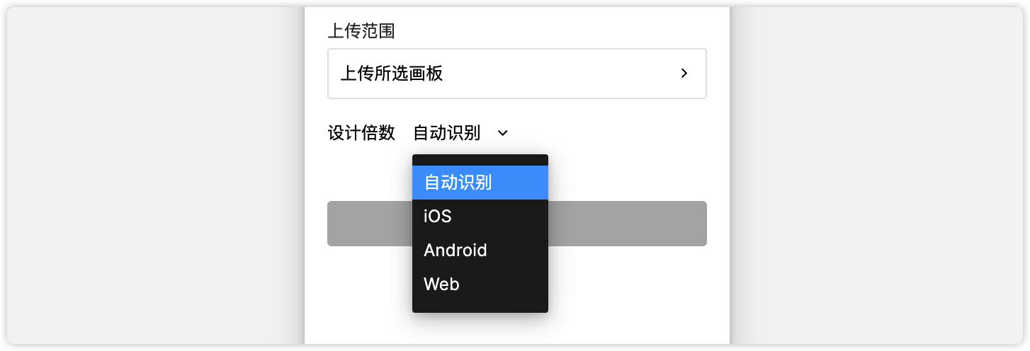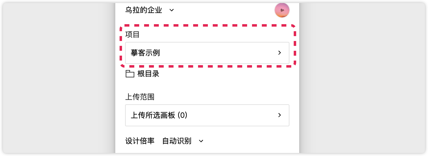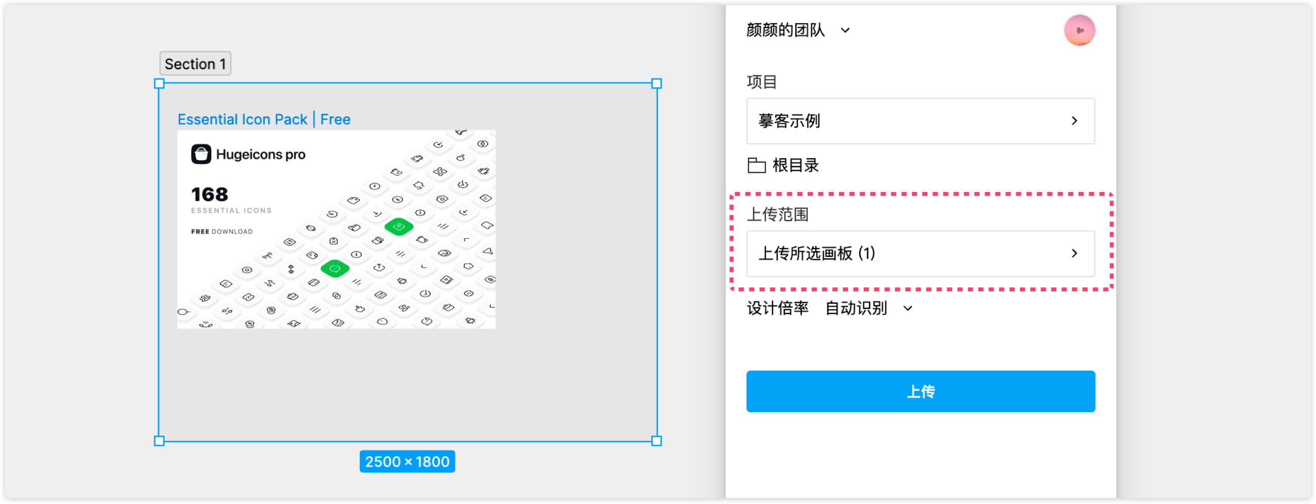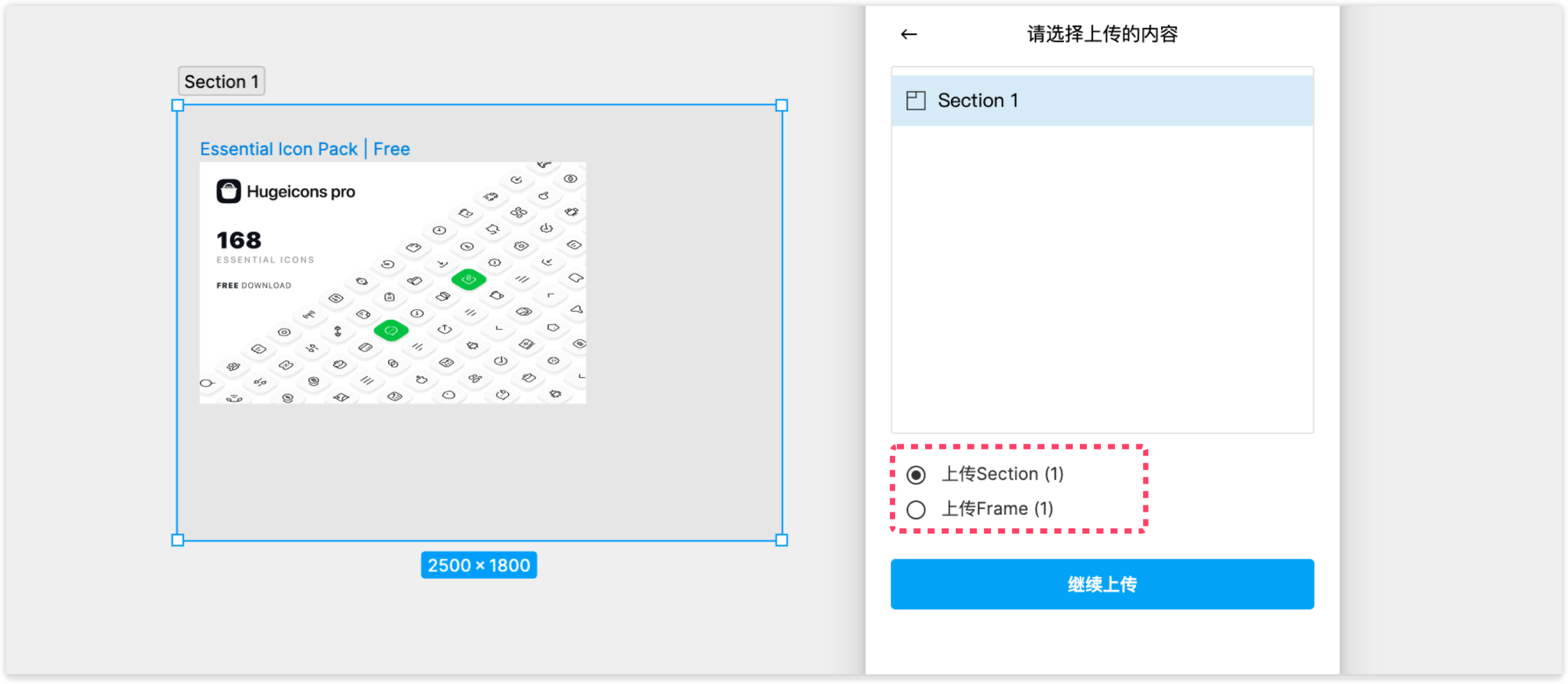 当上传范围选择“上传所选画板”时,并且选中单个或多个 Section 时,支持上传整个 Section 或 上传 Section 内的 Frame。