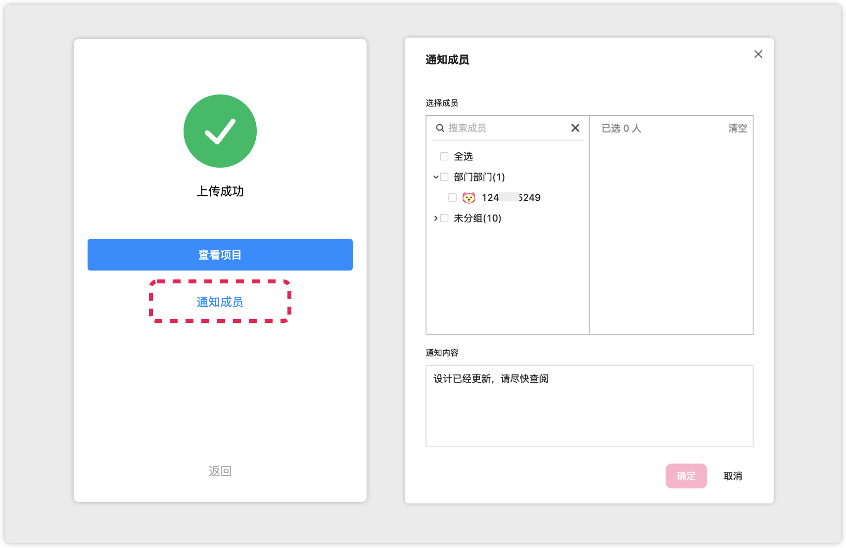 设计稿成功上传后,可指定团队中的成员接收更新通知。点击插件上的“通知成员”,在弹窗中选择需要接收到通知的成员,同时还可以在下方文本框中添加具体的更新内容。