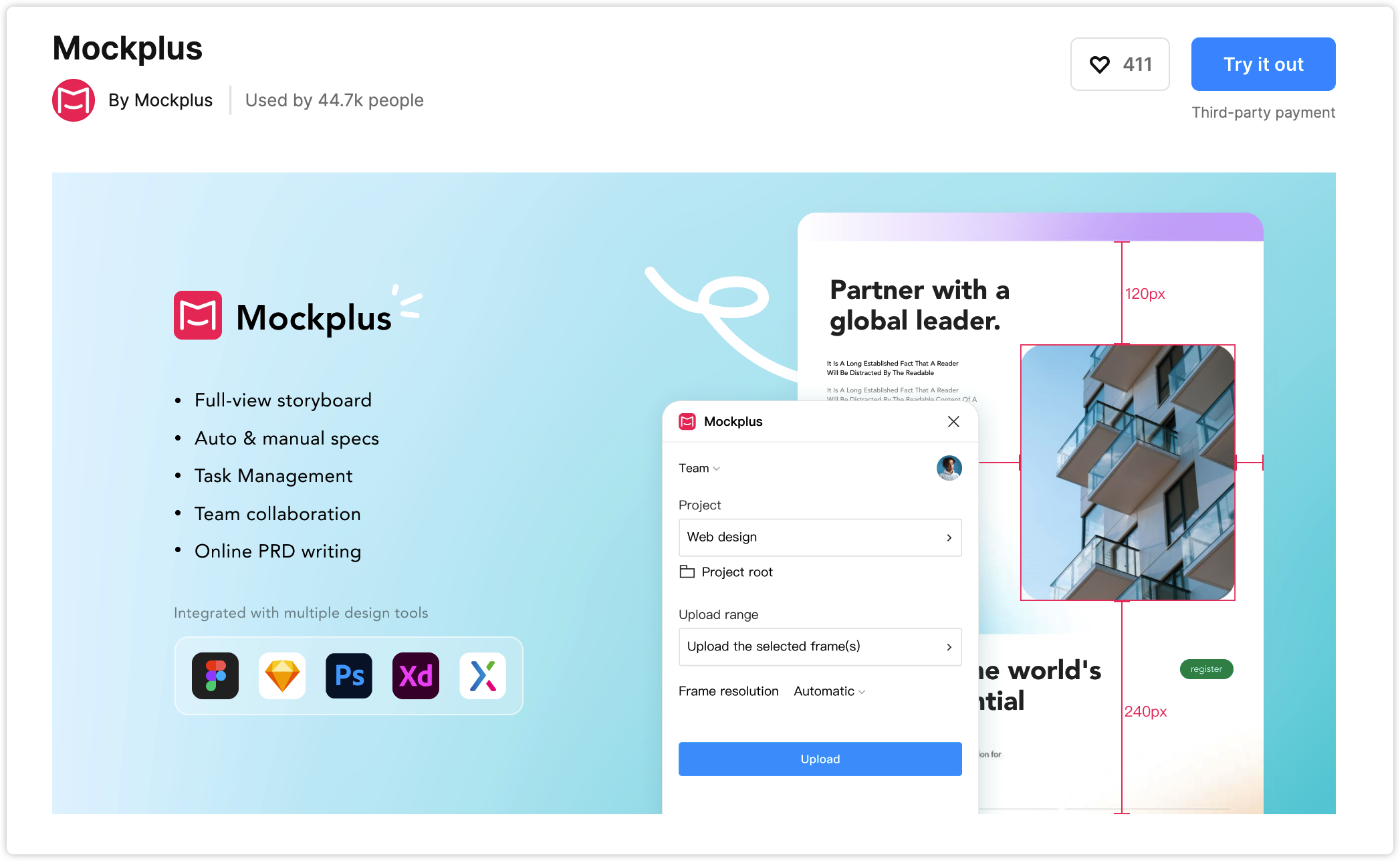 在摹客官网顶部点击“下载-Figma插件”,打开下载页点击“安装”按钮,随后自动跳转到Figma商店中,点击“Try it out”完成安装。