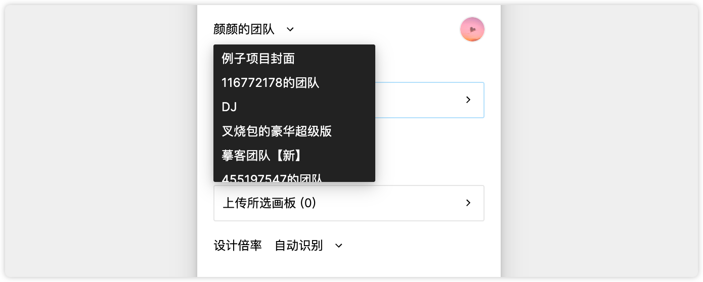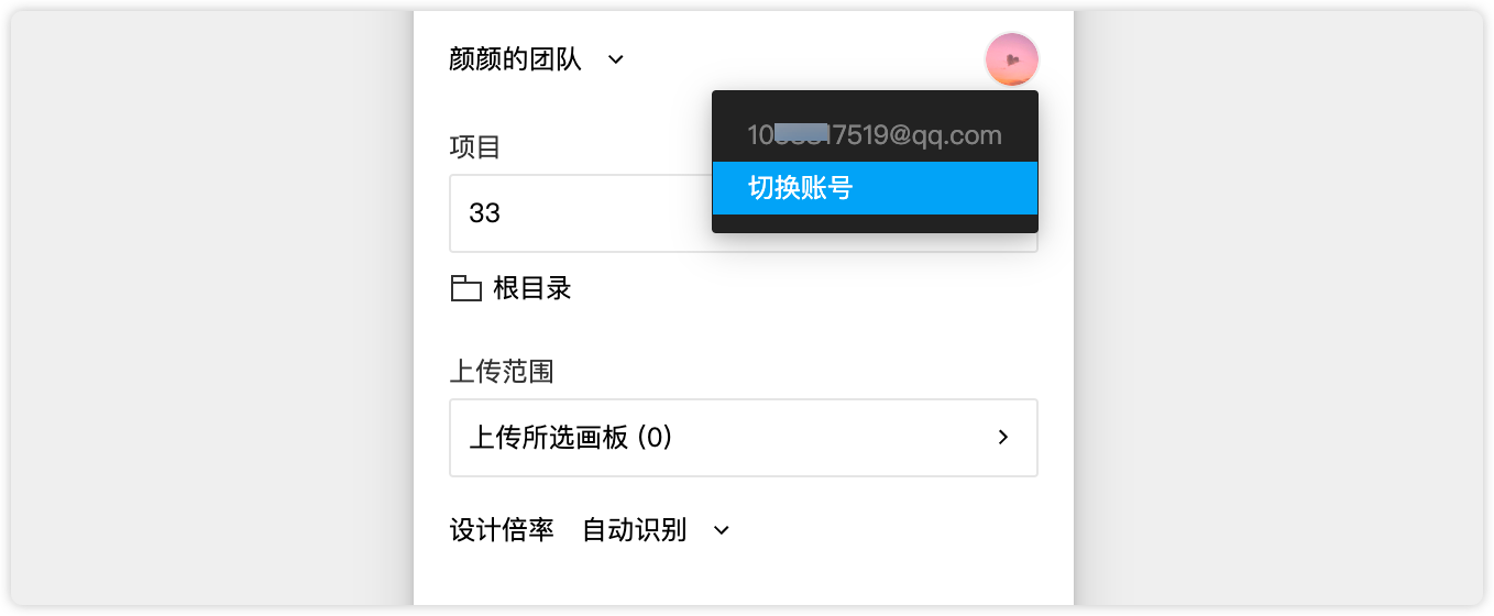 登录后,进入插件上传首页,点击左上角的团队名称即可切换团队;点击右侧头像,可切换当前账号。