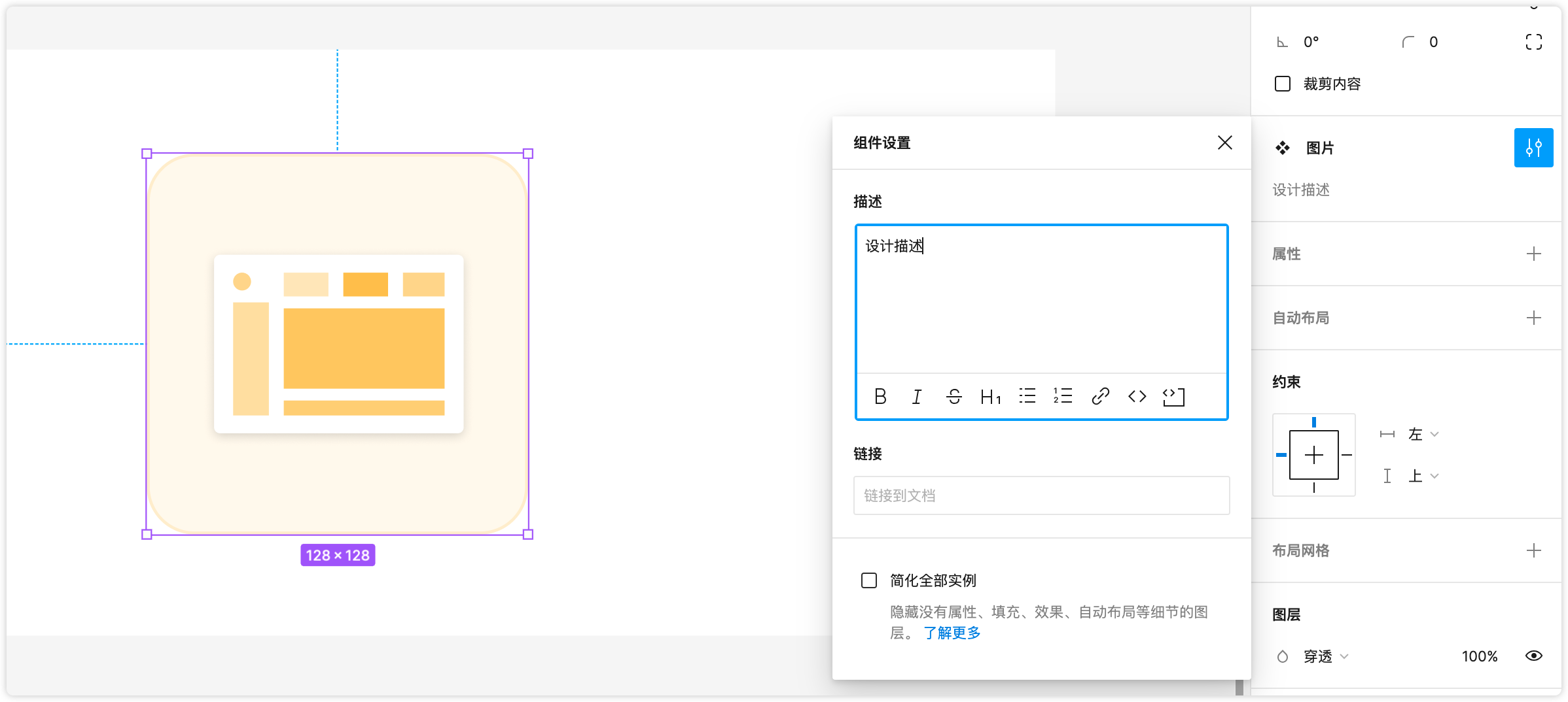 在插件的左下角“更多-设置”中,如果勾选了“上传组件备注信息”,会将组件的描述信息上传到协作并生成设计说明,团队内其他成员可以在定稿模式或开发模式查看组件设计说明信息。
