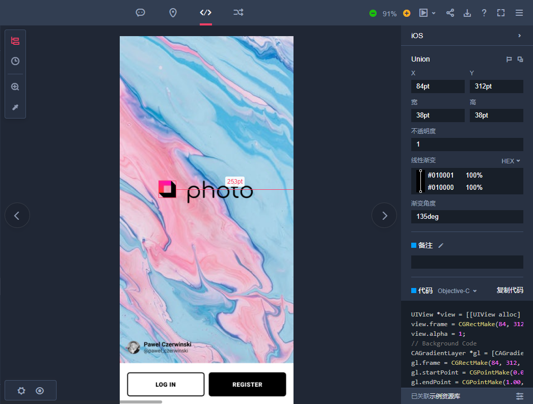 设计稿导入到摹客后,点击元素就能看到间距、颜色、字体样式、阴影、圆角大小等标注信息,还可以手动补充文字、坐标、颜色、尺寸、区域标注,信息更全面,更准确,帮助开发还原设计稿。自动生成的CSS / Android / Objective-C / Swift代码,开发小伙伴可以直接复制使用,为省去了许多繁琐的劳动。