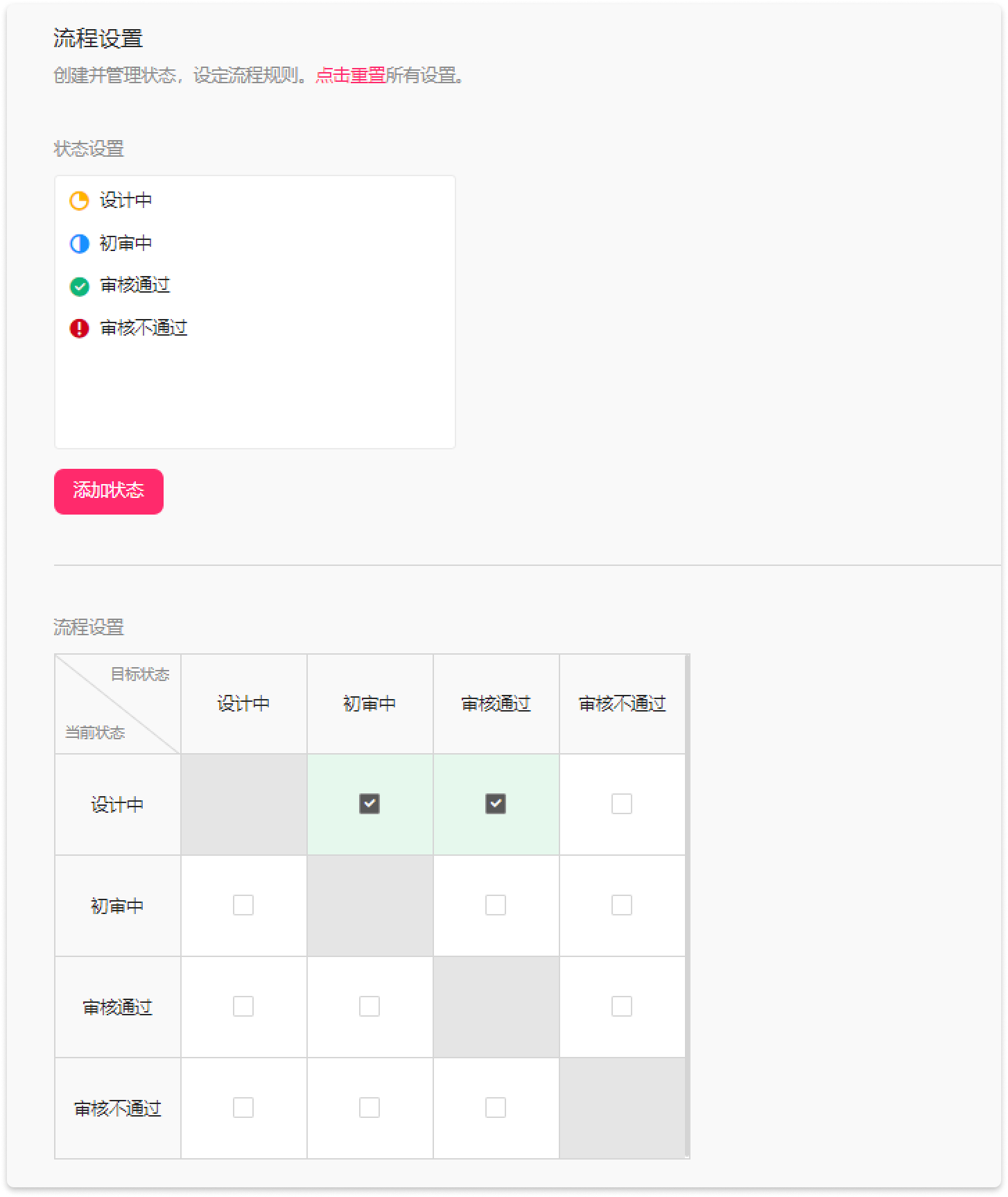 你可以根据本团队工作流程的特点,增加或修改任务状态。完成流程设置后,下方的状态设置表格中会自动对应你修改后的任务状态。表格中的勾选,代表某种状态可以切换到下一状态。例如:设计中(行)->初审中(列),代表当前状态为“设计中”时,可将状态修改为“初审中”。
