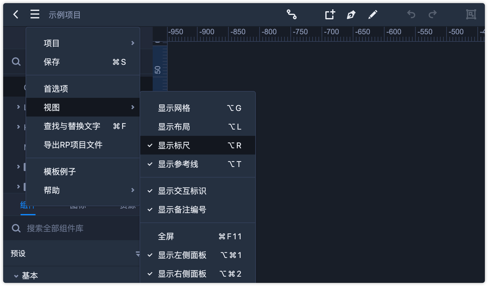 标尺可以帮助你直观地查看画板、组件的尺寸和位置。