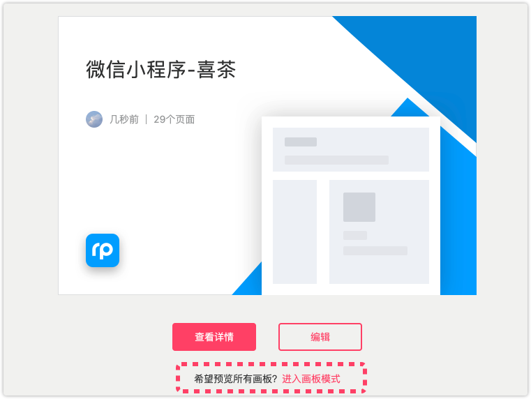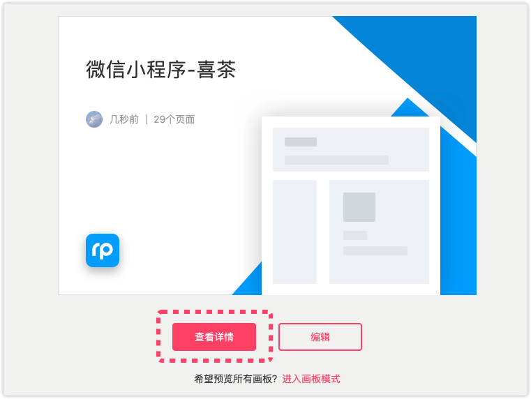 进入协作项目,点击原型稿下的“进入画板模式”,即可进入全貌画板页。