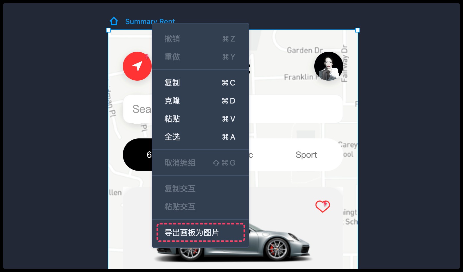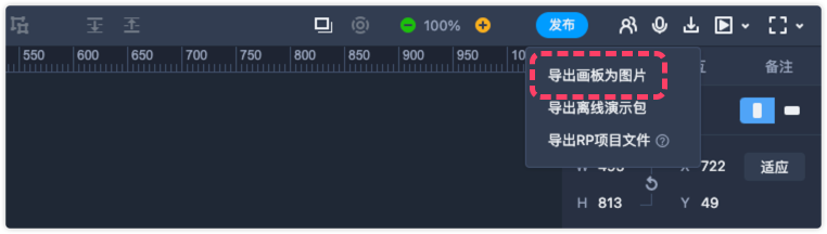 在顶部工具栏的“导出”菜单中,选择“导出画板为图片”。可以批量导出当前页面或整个项目中的所有主画板和辅助画板。