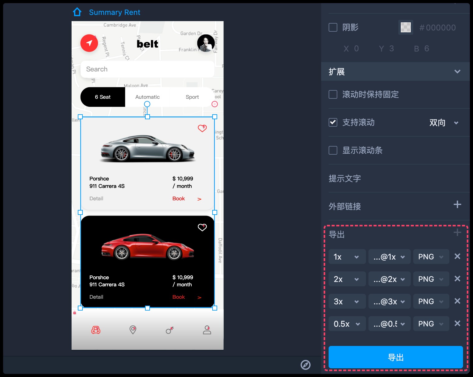 选中图层、组件,你可以在属性面板的扩展属性中找到“导出”选项。点击加号按钮,即可添加导出项。你可以通过设置导出项,单次导出多种参数的图片。尺寸:选择导出图片的大小,提供4种选项:0.5x、1x、2x、3x。