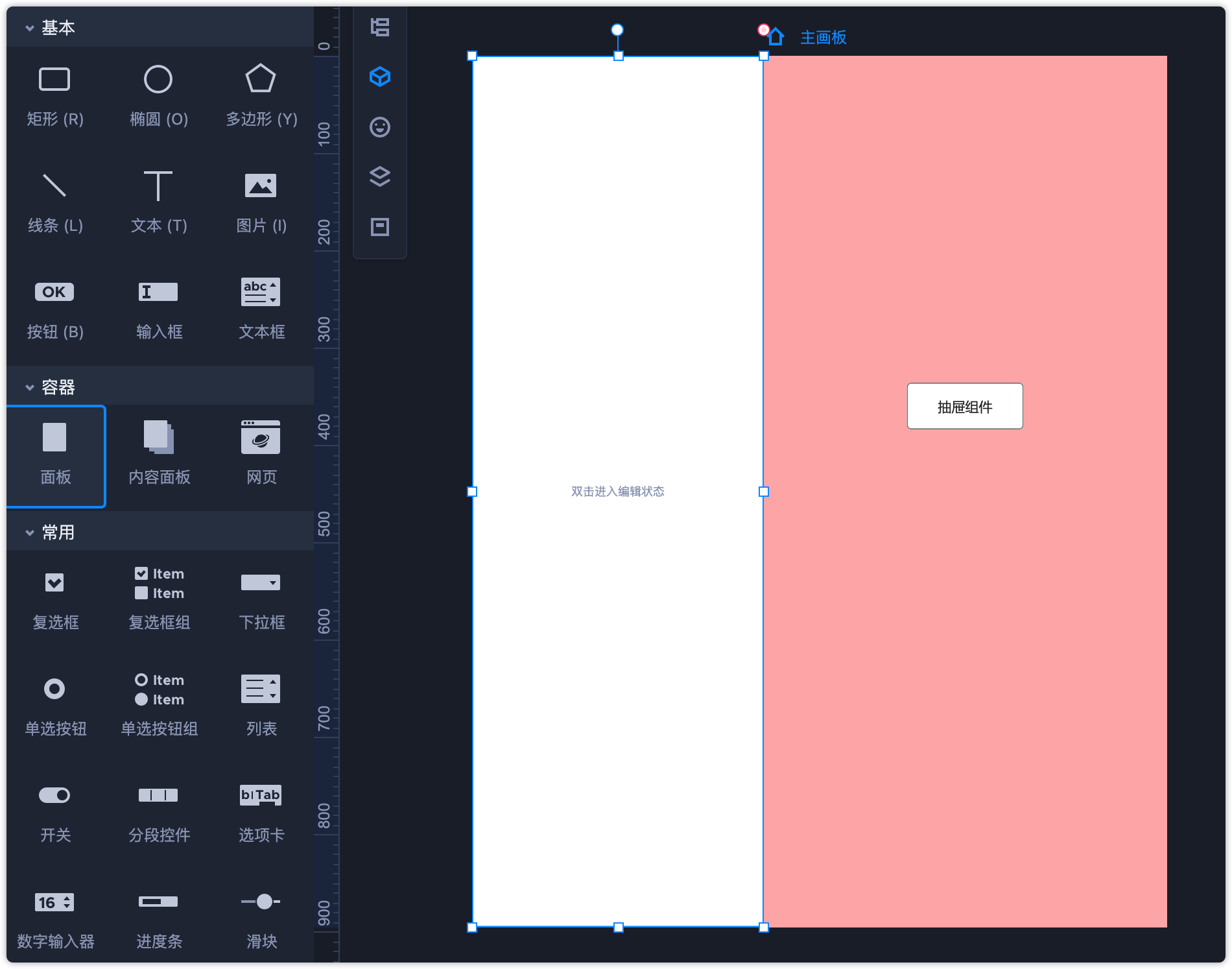 第1步:从组件库拖出一个“按钮”和一个“面板”组件,将面板组件的高度和页面高度保持一致,面板宽度为页面宽度的三分之二。