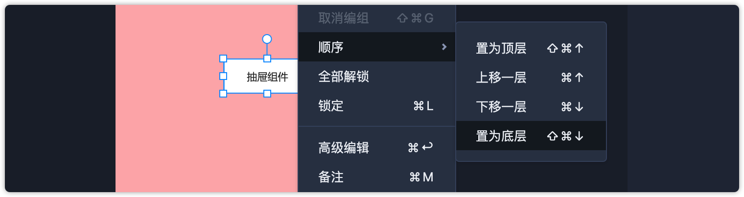第7步:选中按钮组件右键,将按钮的图层顺序“置为底层”,这个操作是为了避免演示时按钮出现在抽屉上方。