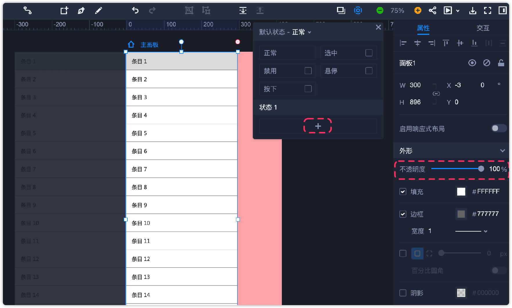 第4步:给面板添加一个“状态1”,该状态下面板的不透明度调为100%,接着将面板向右移动,贴着页面左侧放置,如下图所示。