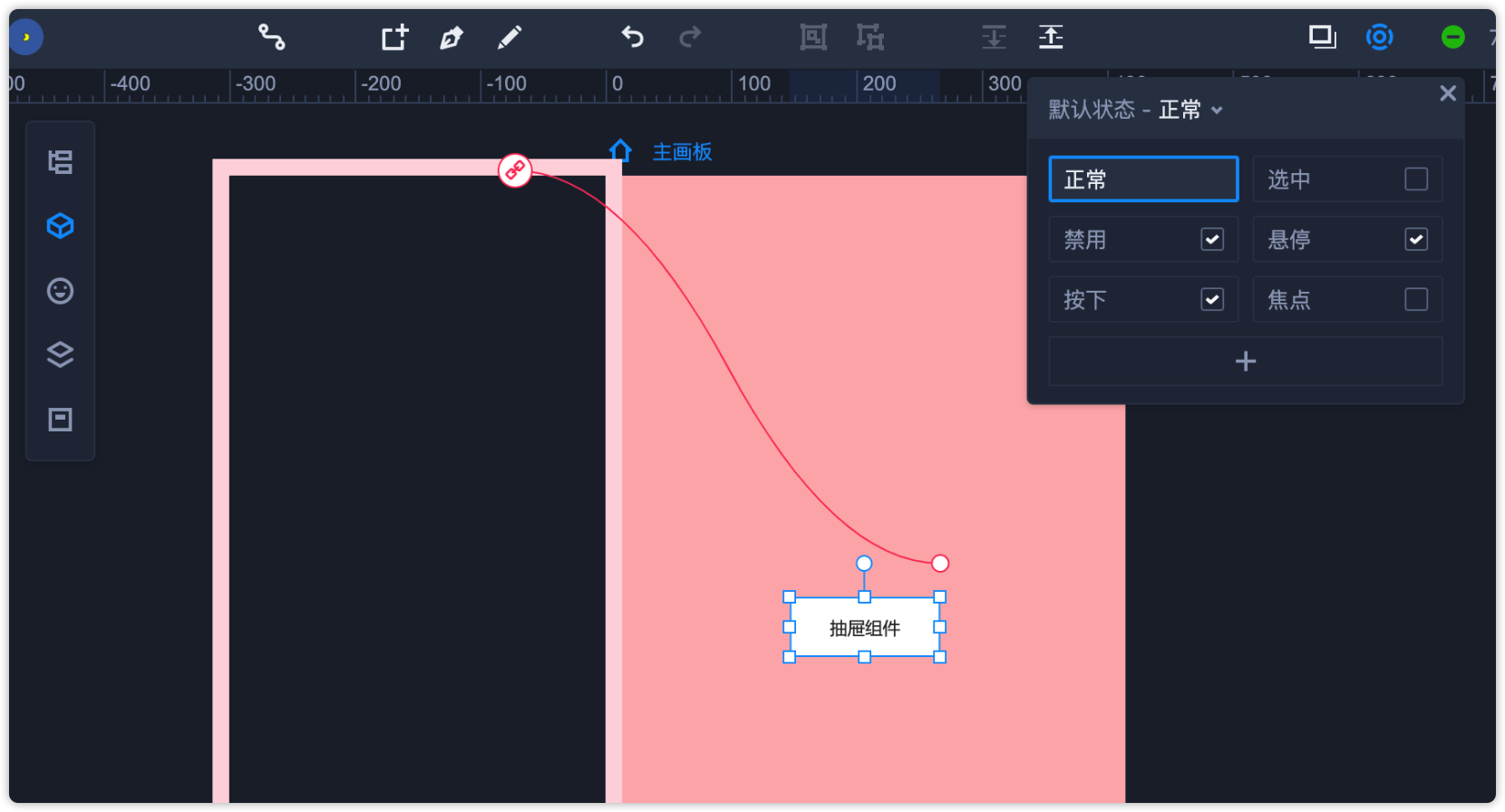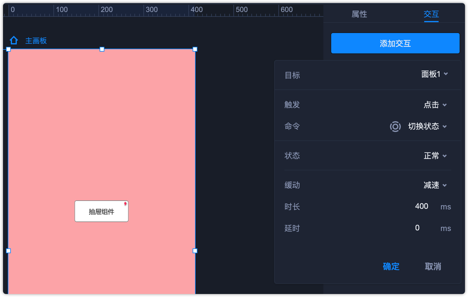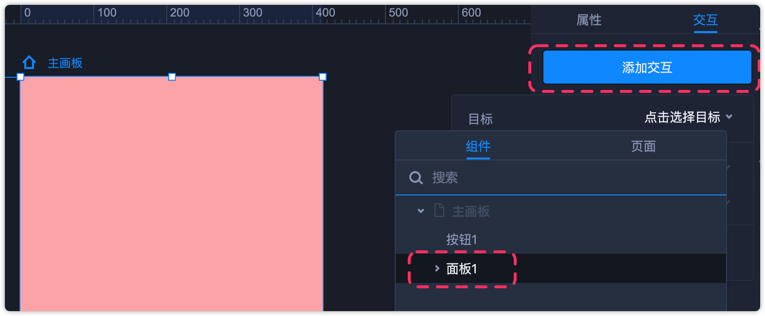 第8步:选中主画板,在右侧属性面板添加交互,目标选择“面板”。