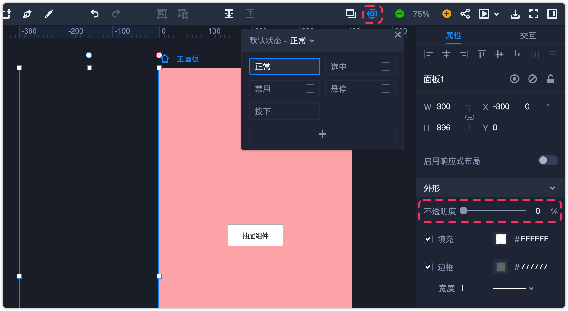 第3步:选中左侧面板,点开上方的“状态面板”,将正常状态下面板的不透明度调为0。
