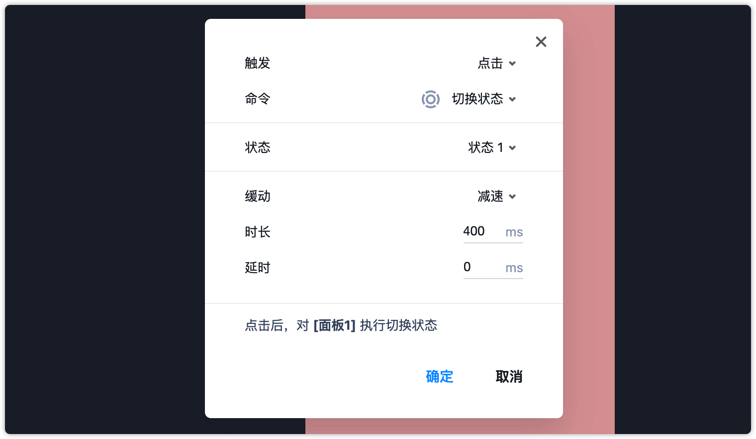 第6步:命令设置为“切换状态”,状态为“状态1”。缓动效果和时长根据需要自由设置。