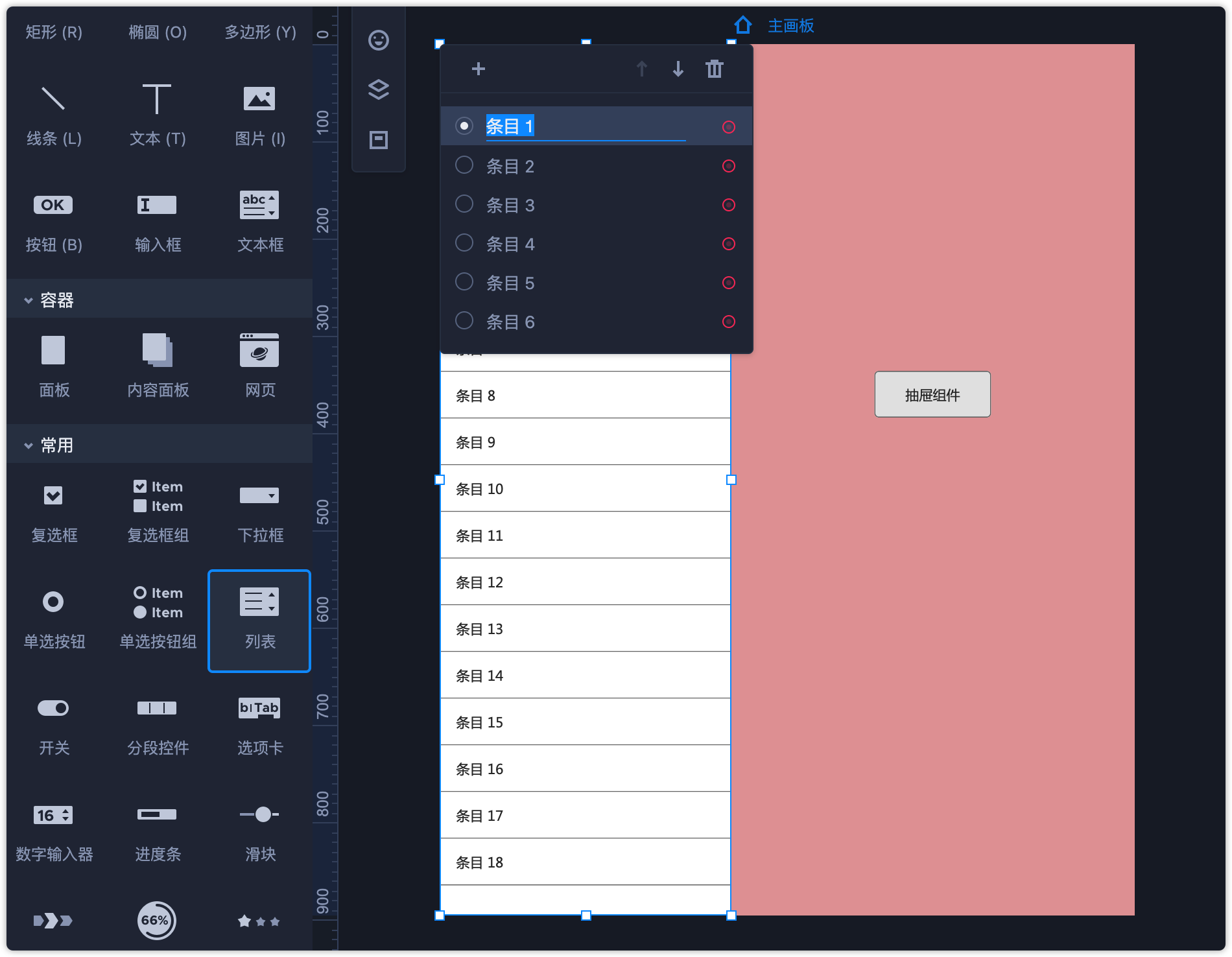 第2步:双击面板组件,进入编辑模式。从组件库拖出一个“列表”组件,选中列表组件后连续按回车,可以依次添加多个列表选项(添加选项后记得将列表高度向下拉伸)。