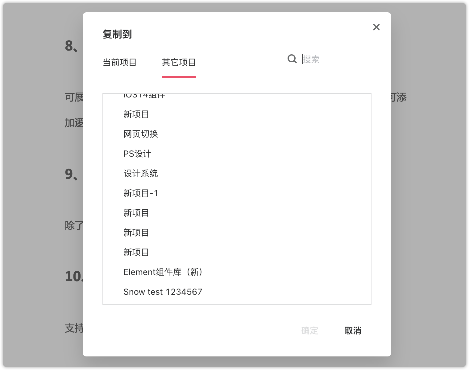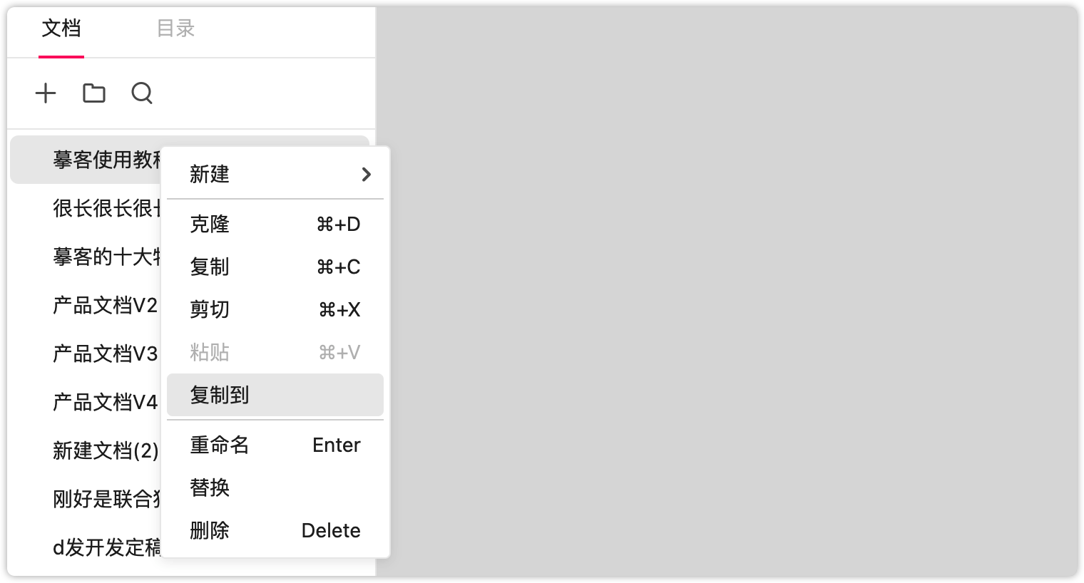 在文档左侧的目录树上选择需要复制的文档,右键->“复制到”,选择目标项目后,会立即生成一个文档副本。注:选择复制到“当前项目”,会在当前目录下生成一个文档副本