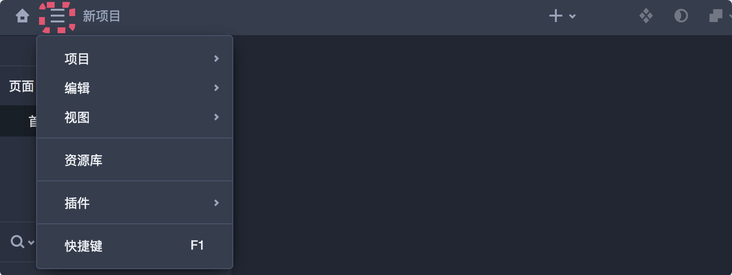 主菜单位于界面左上角,包含:项目、编辑、视图、资源库、插件、快捷键等选项。