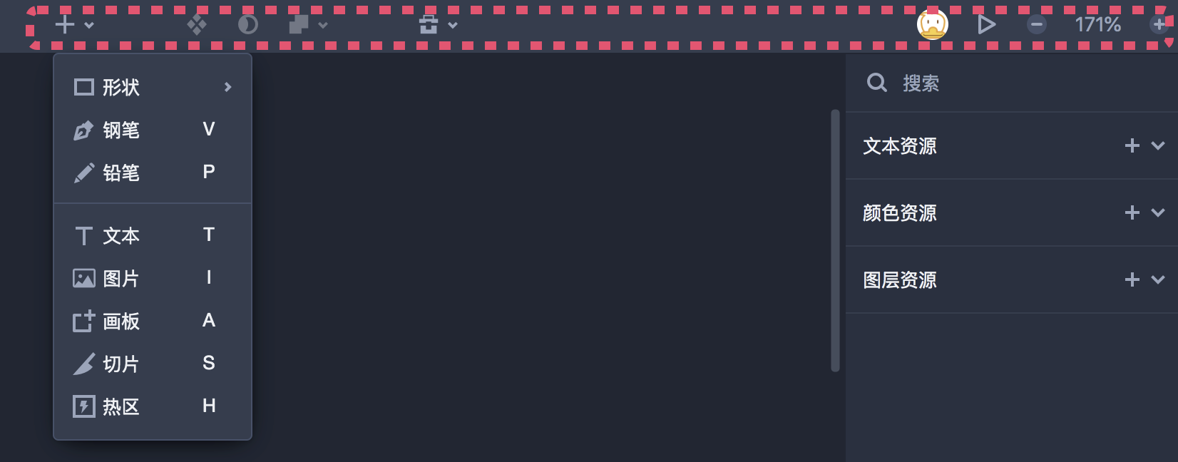 界面顶部包含:常用的编辑工具:形状、钢笔、画板、切片等,创建为组件资源、蒙版、布尔运算、成员头像、演示按钮等。