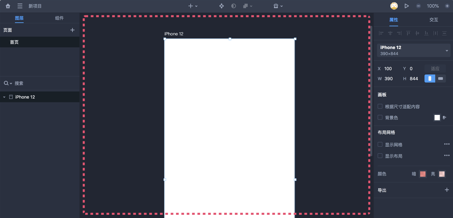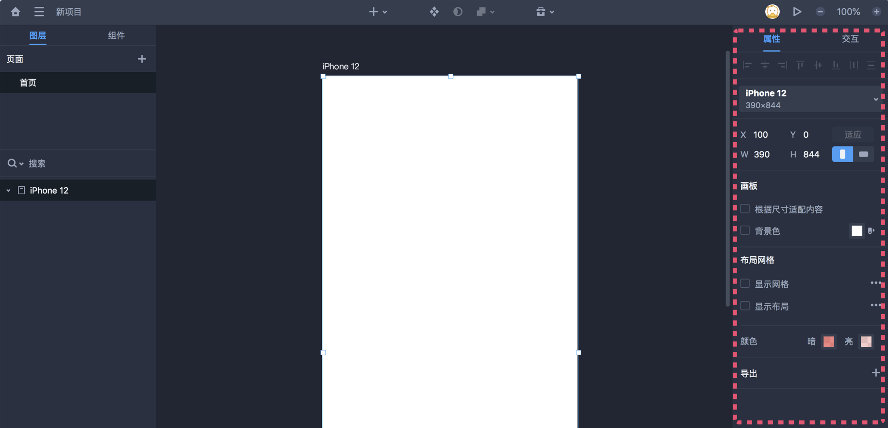 界面右侧包含图层属性展示,包含:对齐设置、位置宽高等其它可调整的属性。切换到属性后方的标签“交互”,可对图层和画板建立交互,还提供了4种交互动画。