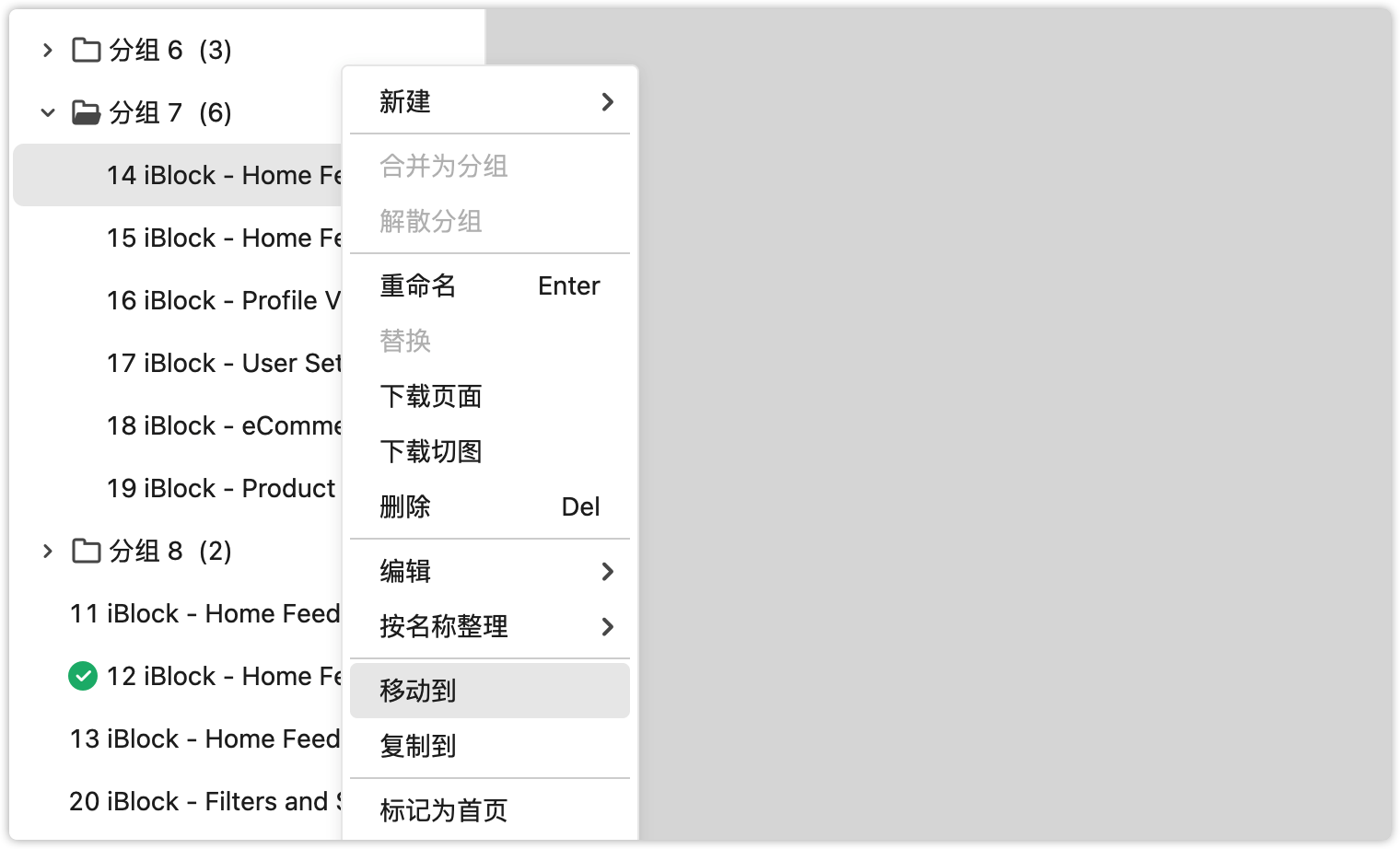 在项目树上选中某个/多个页面,右键->“移动到”,可以将页面移动到当前项目的某个分组或者其它项目中。(注:管理员或超级管理员才有权限移动页面到其它项目中,如果身份是成员,“其它项目”的选项将会置灰)