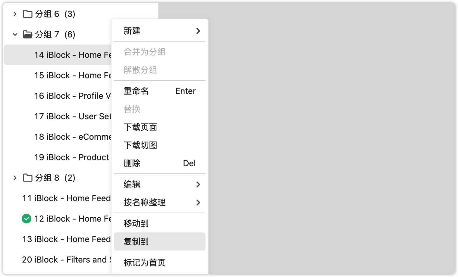 在项目树上选中某个/多个页面,右键->“复制到”,可以将页面复制一个副本,并将副本移动到当前项目的某个分组或者其它项目中;也可以使用快捷键 Ctrl + C/V 复制粘贴到其他项目。(注:管理员或超级管理员才有权限复制页面到其它项目中,如果身份是成员,“其它项目”的选项将会置灰)