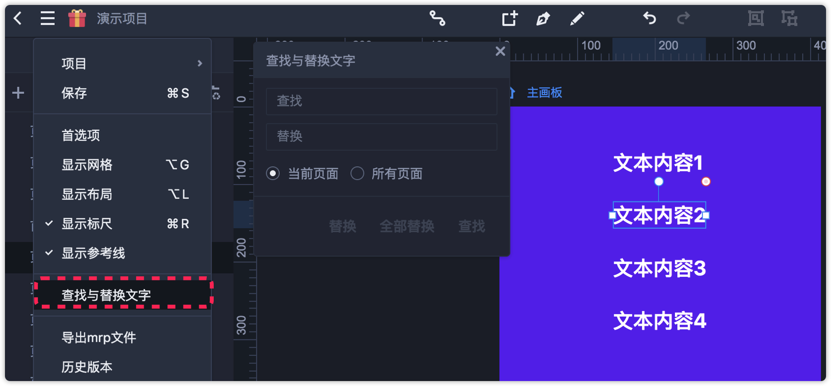 摹客RP支持一键查找并替换设计稿内的关键文字,在工作界面左上角点击“更多”图标 - “查找与替换文字”,在弹窗中可以输入关键字查找,查找到的信息能快速定位。也可以选择替换当前页面或所有页面的文字。